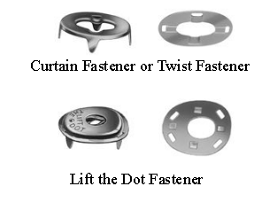 The curtain fastener (twist fastener) and the Lift-The-Dot fasteners all come with two parts – the 4 prong male top side and the female backing plate which sandwiches the fabric between itself and the male side. The prongs crimp down and hold tight to the backing plate. Both of these boat cover snap fasteners can be installed with a little patience and without expensive tools.